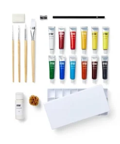 - Comes with 4 paintbrushes, pencil, pencil sharpener, kneaded eraser, masking fluid, palette, sponge and mixing chart