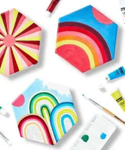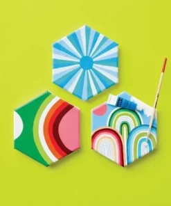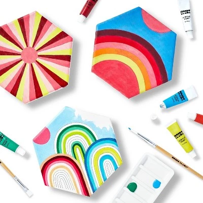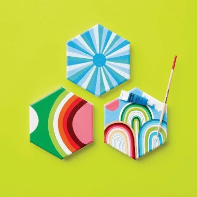 Add a little magic to your artistic creations with the Paint-Your-Own Hexagon Canvas Kit Rainbow from Mondo Llamaâ„¢. This canvas art kit features three hexagon-shaped canvases, each with a different rainbow design for a fun look you’ll love. It comes with six acrylic paints in blue, green, red, orange, yellow and white so you can add vibrant hues, while a wide, medium and thin brush let you fill in each outline beautifully. Perfect as a relaxing weekend activity, this rainbow hexagon canvas kit is sure to fill your day with color.