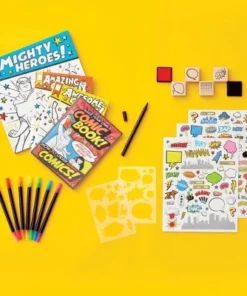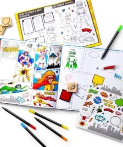 - Comes with markers, wood stamps and stamp pads, stickers, stencils, 2 soft cover comic books and 1 hardcover comic book
