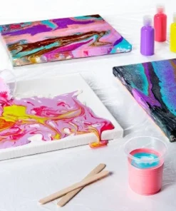 - Simply pour paints on canvas, allow colors to flow together and use a craft stick to create designs